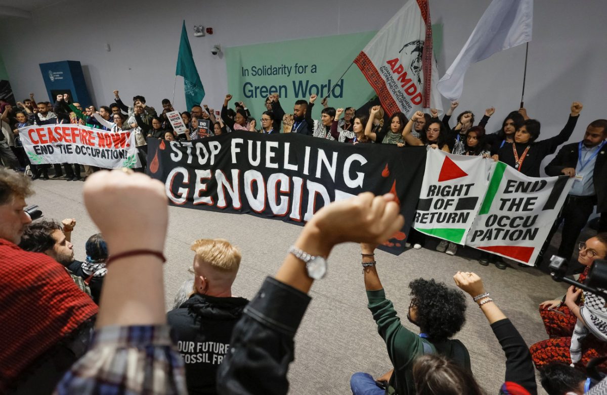 Ακτιβιστές του κλίματος σε διαμαρτυρία υπέρ των Παλαιστινίων την πρώτη μέρα της COP29 (Reuters)