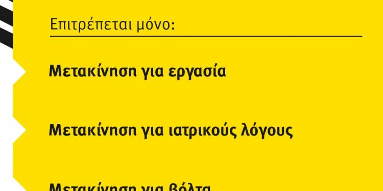 Η μετακίνηση επιτρέπεται αυστηρά και μόνο για λόγους εργασίας, υγείας και συνοδείας των κατοικίδιων ζώων σε κοντινή απόσταση από την κατοικία.
